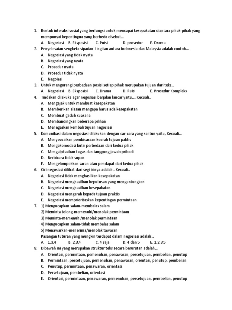 Melanjutkan tulisan soal bahasa indonesia kelas x semester 2 kurikulum 2013 pilihan ganda wajib bagian pertama soal nomor 1 10 bagian kedua dimulai dari soal nomor 11 25. 20210323 contoh soal negosiasi pilihan ganda beserta jawabannya inilah contoh soal negosiasi pilihan ganda beserta jawabannya dan hal lain yang berhubungan erat dengan contoh soal negosiasi pilihan ganda beserta jawabannya serta aspek k3 secara umum di indonesia. Negosiasi selalu berakhir pembelian c. Untuk bisa menjawabnya cukup mudah, yakni kamu sudah memahami apa tujuan dari teks negosiasi. 20201205 bahasa indonesia soal uraian januari 11 2019 07 00.